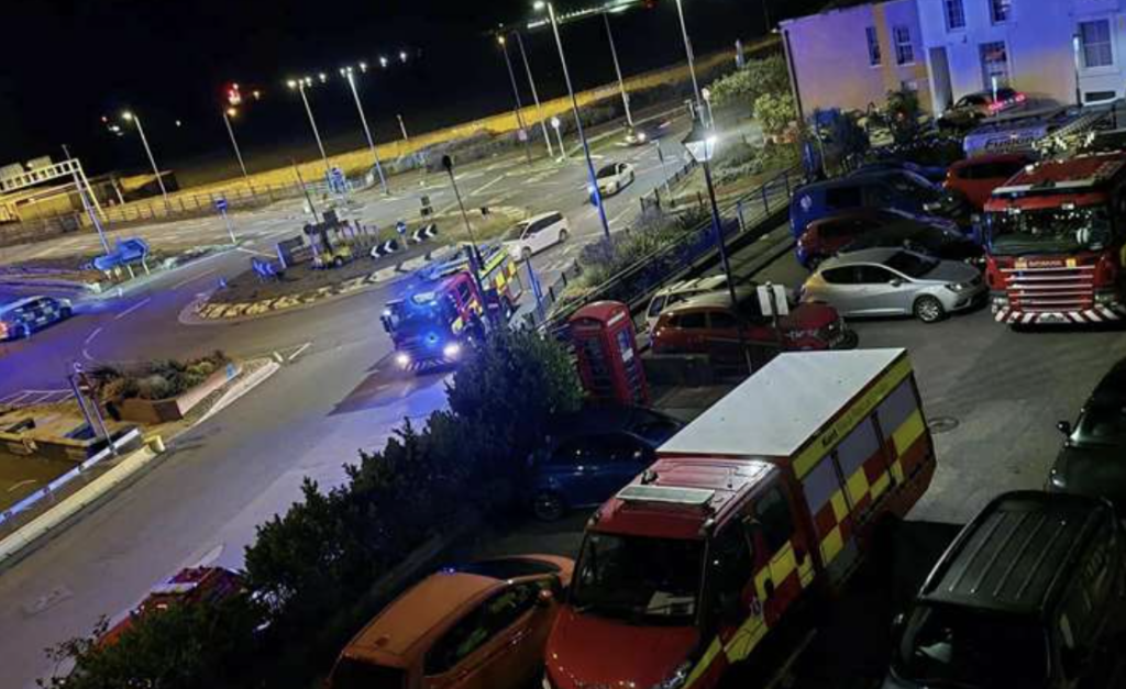 Jubilee Way flyover, overlooking the Port of Dover’s Eastern Docks, was sealed off as police, paramedics, and four fire engines swarmed the scene. A height vehicle and a specialist rescue unit were also deployed.