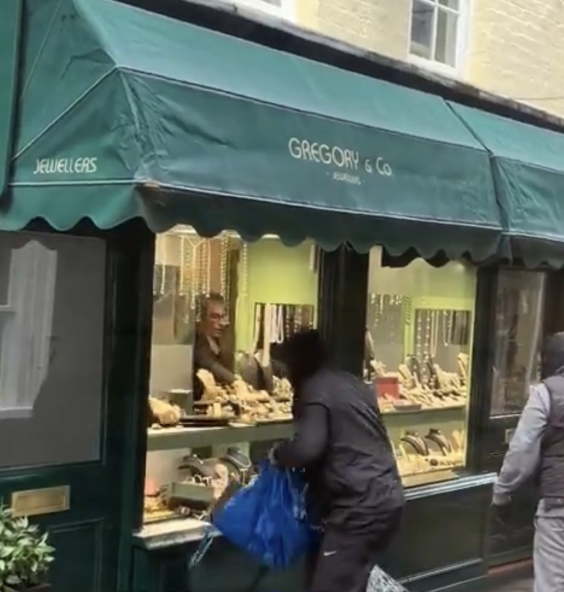 On a busy Saturday morning, two men dressed head to toe in black smashed the window of Gregory & Co. with a huge hammer. When the glass wouldn’t break, one thug tried ripping it out by hand before they grabbed the jewellery on display and stuffed the loot into a blue carrier bag.