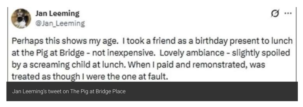 Jan’s birthday lunch may have been spoiled, but The Pig remains firm on being a family-friendly hotspot—whether noisy tots like it or not.